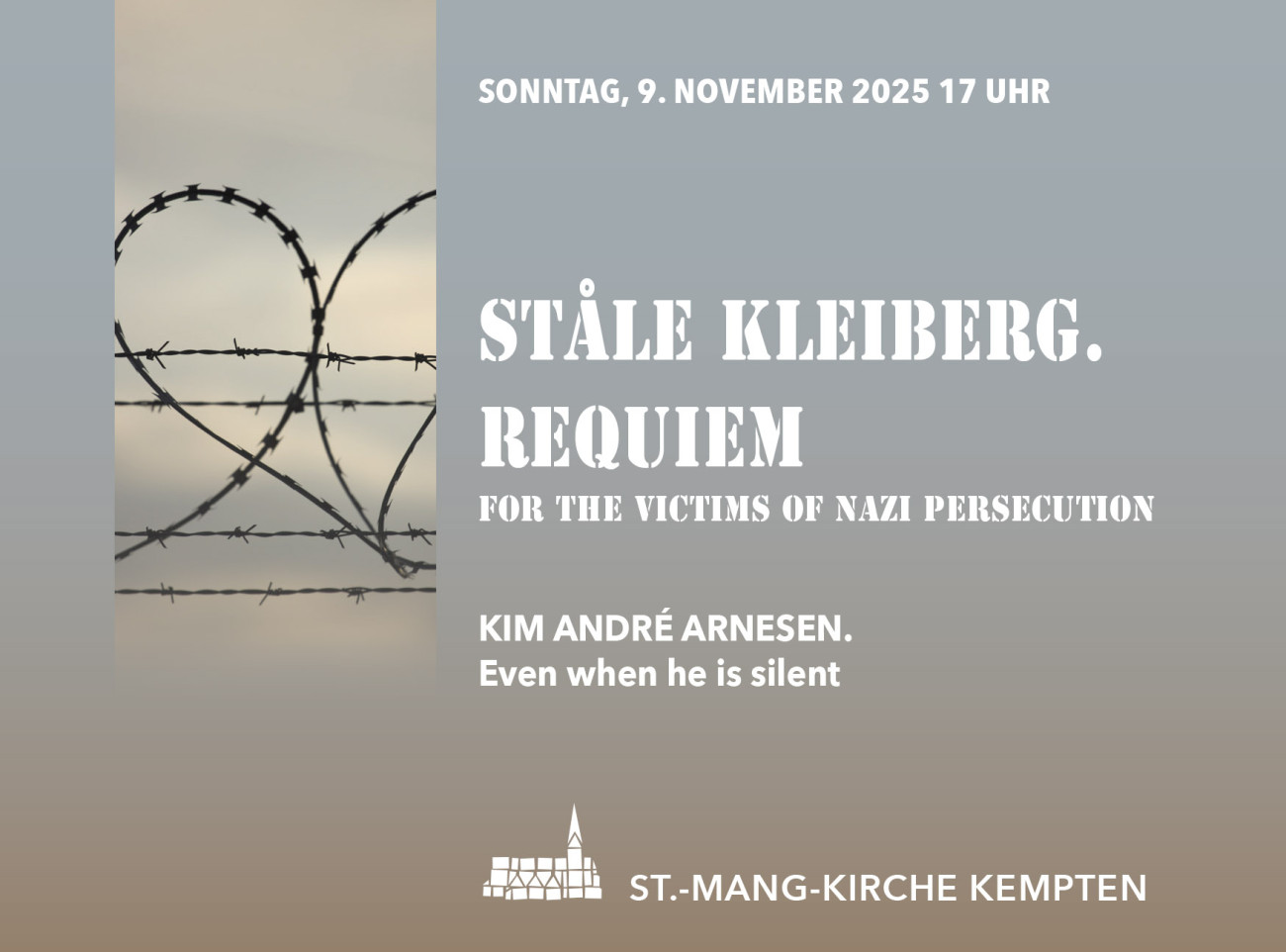 Das Requiem des norwegischen Komponisten Ståle Kleiberg (*1958) wurde im Jahr 2002 uraufgeführt und verbindet das liturgische Requiem mit poetischen Texten des britischen Lyrikers Edwin Morgan. Das Werk ist eine musikalische Erinnerung an die Millionen Opfer der nationalsozialistischen Verfolgung – an all jene, die wegen ihrer Herkunft, ihres Glaubens, ihrer Überzeugung oder ihrer sexuellen Orientierung entrechtet, verfolgt und ermordet wurden. Ein musikalisches Mahnmal – gegen das Vergessen und für die Würde jedes einzelnen Menschen.